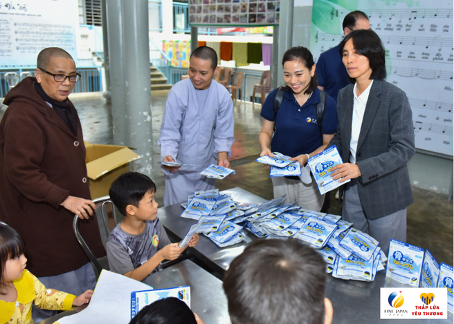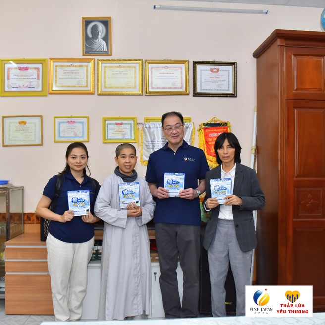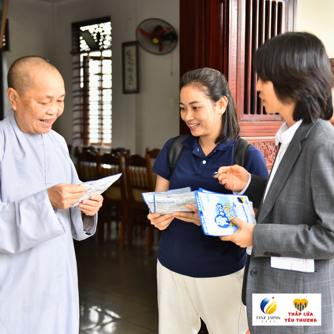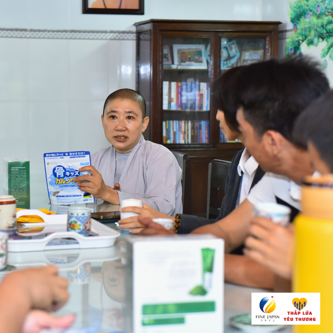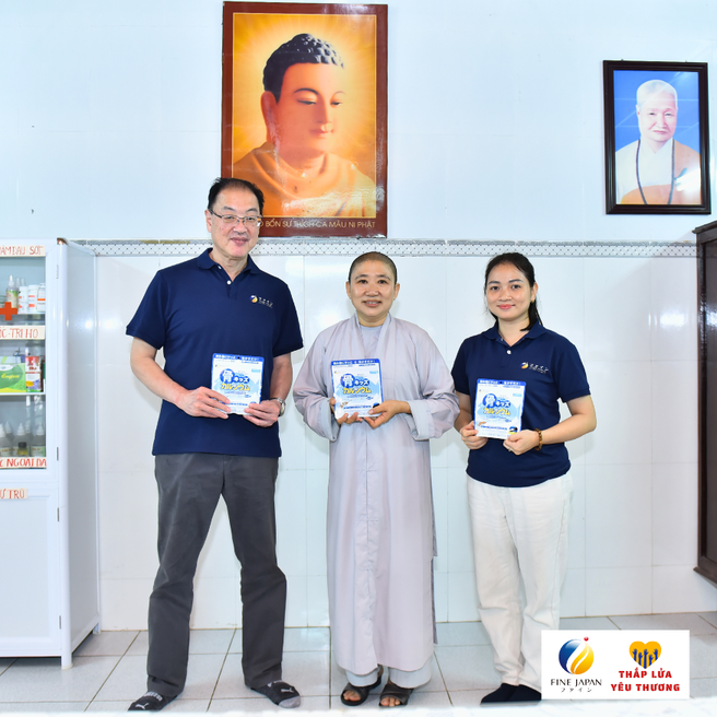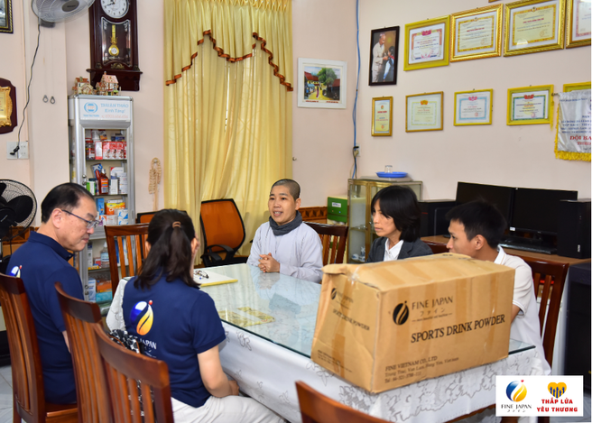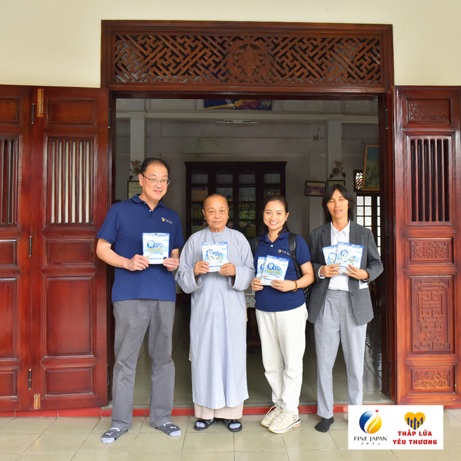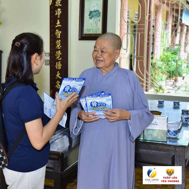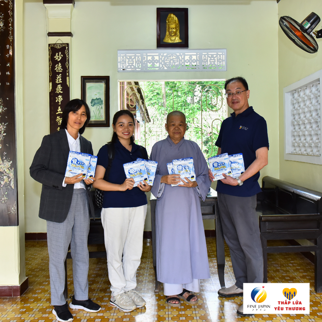 Ngày 7/12 vừa qua , Công ty TNHH FINE VIỆT NAM đã ghé thăm 10 điểm chùa khó khăn, dành tặng 800 gói Canxi Cá Tuyết cho 140 trẻ em khuyết tật, 50 mẹ già không nơi nương tựa, 70 bé sơ sinh, bé nhỏ bị bỏ rơi và 500 em học sinh THCS và THPT đang cư trú tại các chùa trên địa bàn thành phố Huế với tổng giá trị 224 triệu đồng.