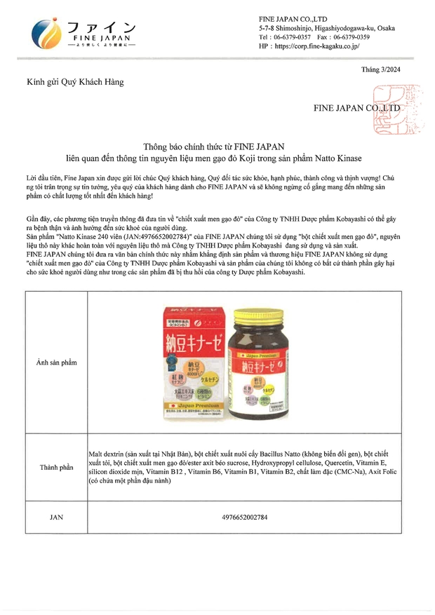 FINE JAPAN chúng tôi đưa ra văn bản chính thức này nhằm khẳng định sản phẩm và thương hiệu FINE JAPAN không sử dụng ''chiết xuất men gạo đỏ'' của Công ty TNHH Dược phẩm Kobayashi và sản phẩm của chúng tôi không có bất cứ thành phần gây hại cho sức khoẻ người dùng như trong các sản phẩm đã bị thu hồi của công ty Dược phẩm Kobayashi.